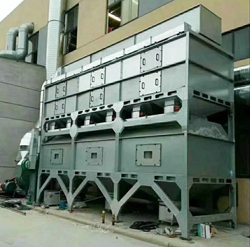在化學(xué)反應(yīng)過程中,利用催化劑降低燃燒溫度,加速有毒有害氣體完全氧化的方法,叫做催化燃燒法。由于催化劑的載體是由多孔材料制作的,具有較大的比表面積和合適的孔徑,當(dāng)加熱到300~450℃的有機(jī)氣體通過催化層時(shí),氧和有機(jī)氣體被吸附在多孔材料表層的催化劑上,增加了氧和有機(jī)氣體接觸碰撞的機(jī)會(huì),提高了活性,使有機(jī)氣體與氧產(chǎn)生劇烈的化學(xué)反應(yīng)而生成CO2和H2O,同時(shí)產(chǎn)生熱量,從而使得有機(jī)氣體變成無毒無害氣體。